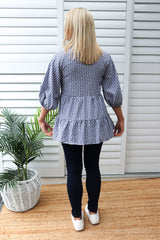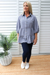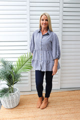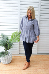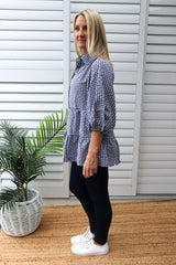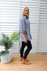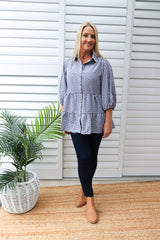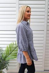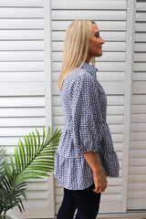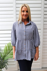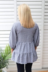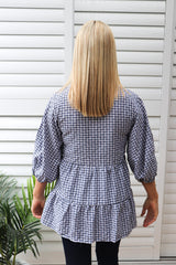 Features a gorgeous navy checkered fabric. A collared neckline with featured wooden buttons. Puffy elastic arms and a tiered bodice. Looks perfect with our our High Waisted Stretch Cotton Pant in Navy.