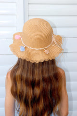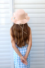 It has a wavelike brim and beautiful pastel flowers around. It also comes with an internal tie to help keep it on her head for those windy days!
