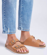 Comfort & style. The Perfect Summer Shoe. Featuring a double silver metal buckle closure with adjustable width • Leather upper, non leather lining, non - leather sole • Designed in Australia • Made in Vietnam