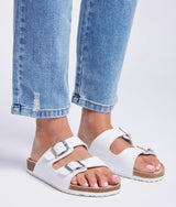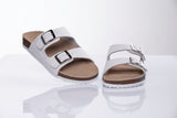Comfort & style. The Perfect Summer Shoe. Featuring a double silver metal buckle closure with adjustable width • Leather upper, non leather lining, non - leather sole • Designed in Australia • Made in Vietnam