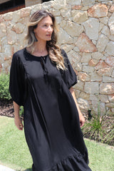 It's a beautiful boho long relaxed style, complementary v neckline with tie & tassels , short puffy elastic relaxed sleeves with a frill bottom.