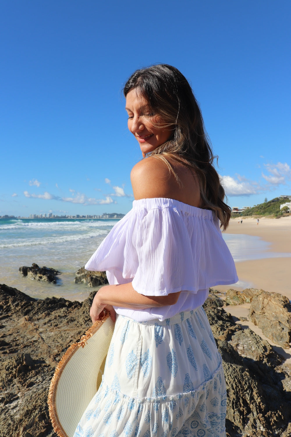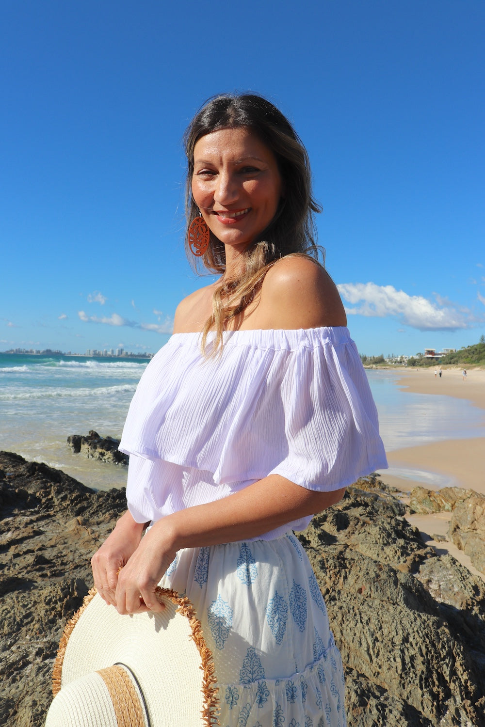 You can wear this cool and comfy top on or off the shoulders. Goes fabulous with any of our skirts or pants for that super comfy flowy look!