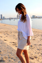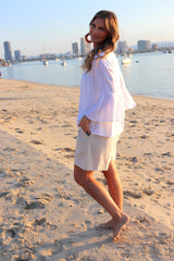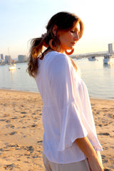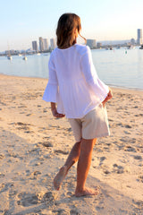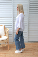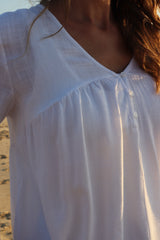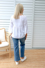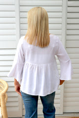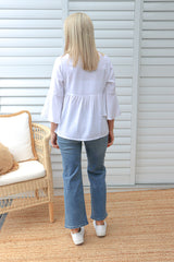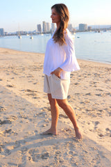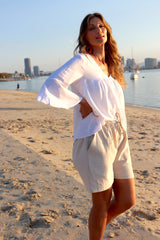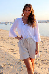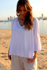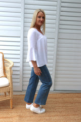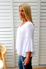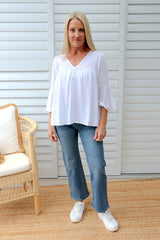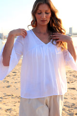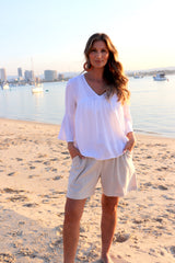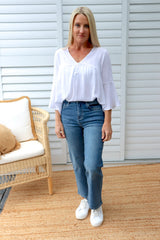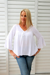 Features a beautiful Linen Rayon Fabric. A complimentary V neckline with featured buttons. Flowy arms and bodice. Wear it relaxed & out or tuck it in. Looks perfect with our Stretchy High Waisted Jeans or our Dream Pant ( the Pant 'everyone' is raving about)