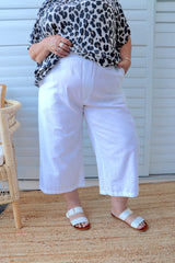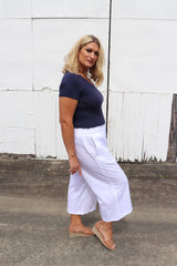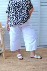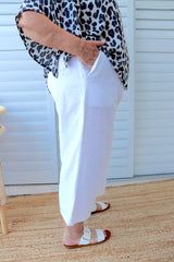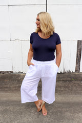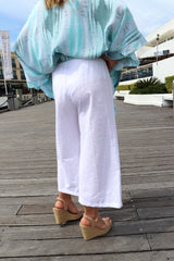 Features a gorgeous wide leg 100% cotton that looks like linen and feels like cotton to give you an ultra comfortable version of that iconic summer style. Available in 3 sizes with an elastic waistband and pockets, this pant is for every size and every age.