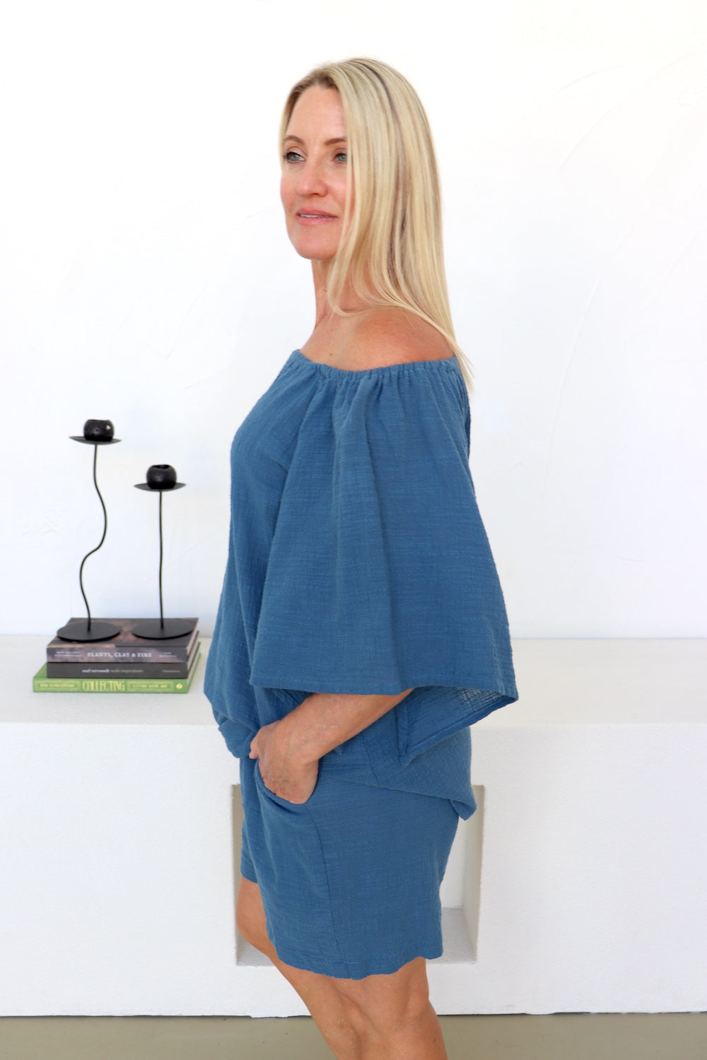 Fantastic and versatile top featuring : Off or on the shoulders with a 3/4 diagonally cut arm that makes you feel soft, comfy and flowy :) Goes perfectly with all of our bottoms, especially our Lighthouse Shorts!