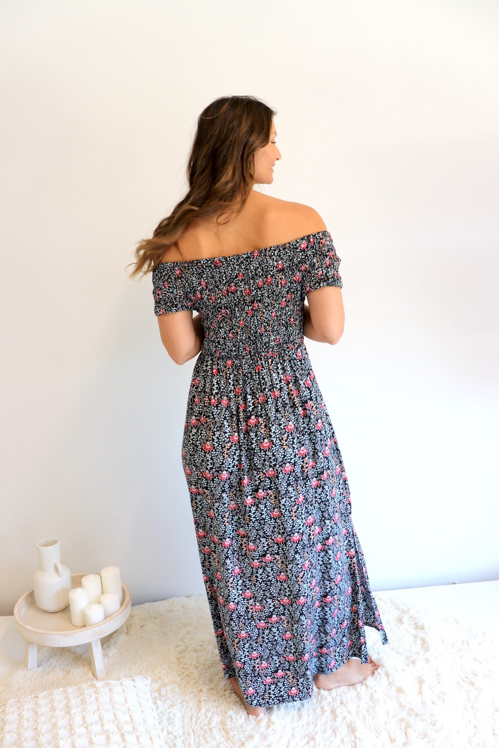The one-size elasticised bodice is designed to flatter and can be worn on or off the shoulders for versatile styling. Flowing full in length with two chic side splits, it’s both elegant and easy to wear.
