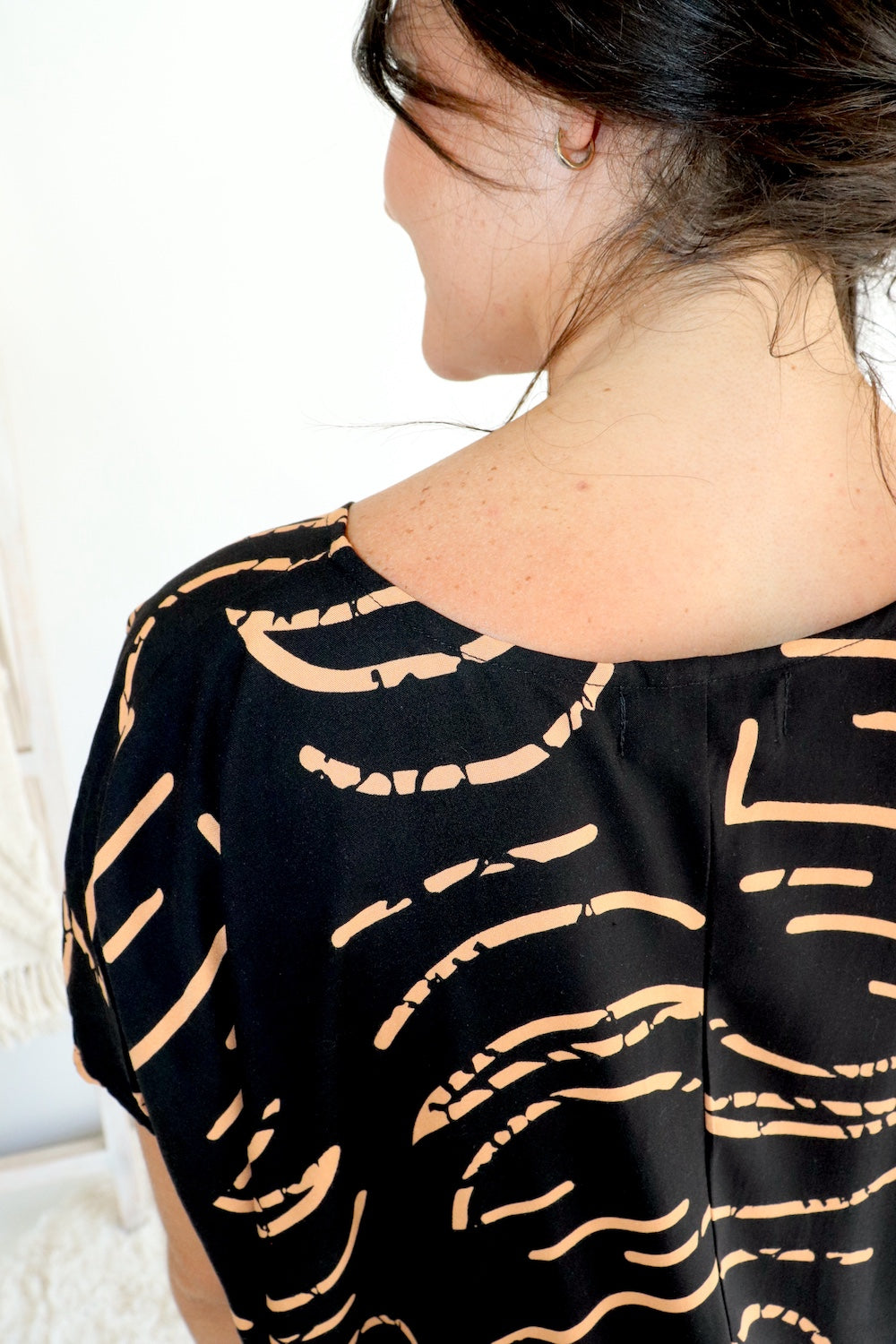 Crafted to flatter, it features a delicate v-neckline and a chic peak front, blending sophistication with effortless ease. The lower back hemline adds a graceful drape, enhancing its modern, stylish appeal.