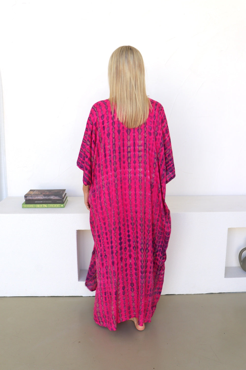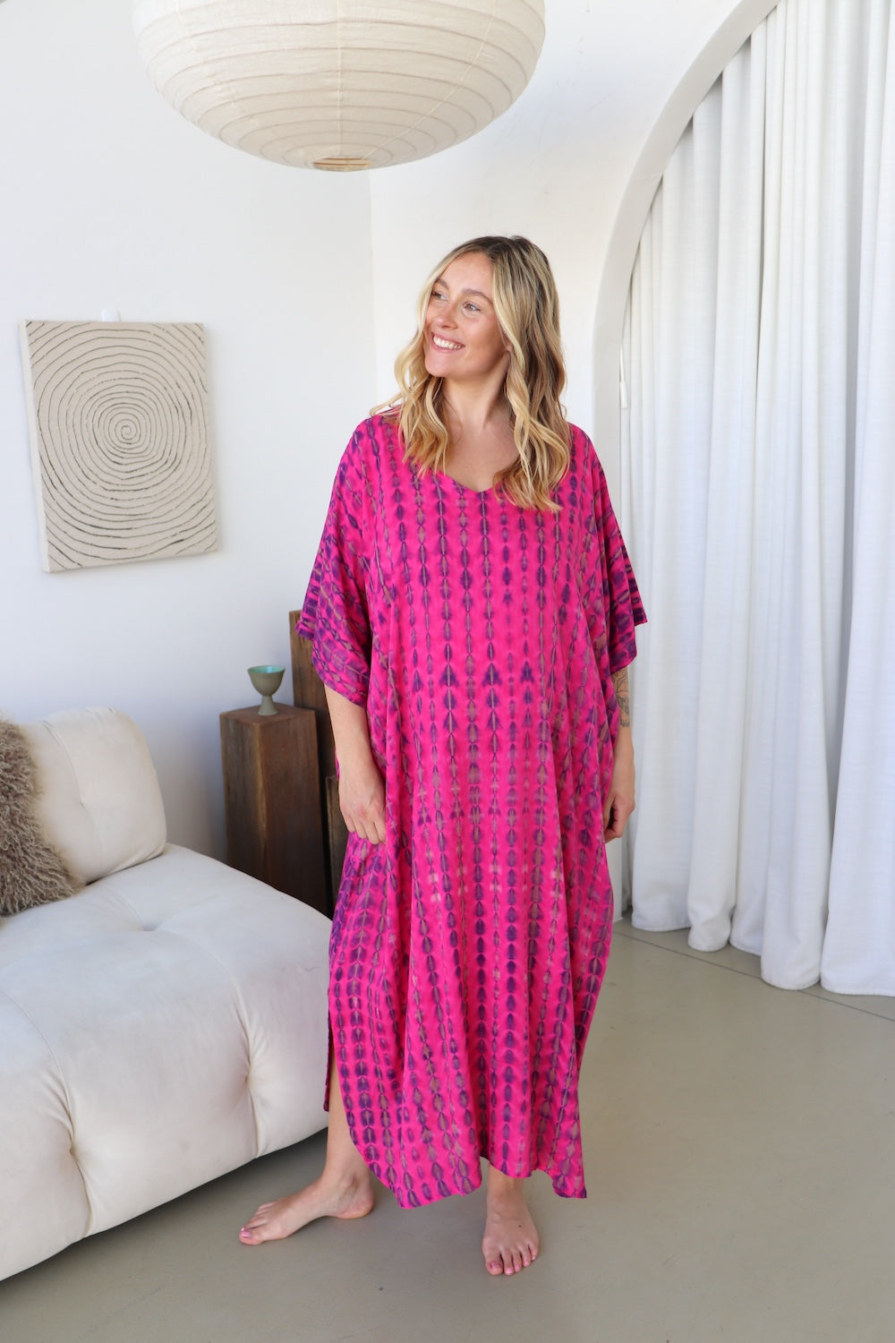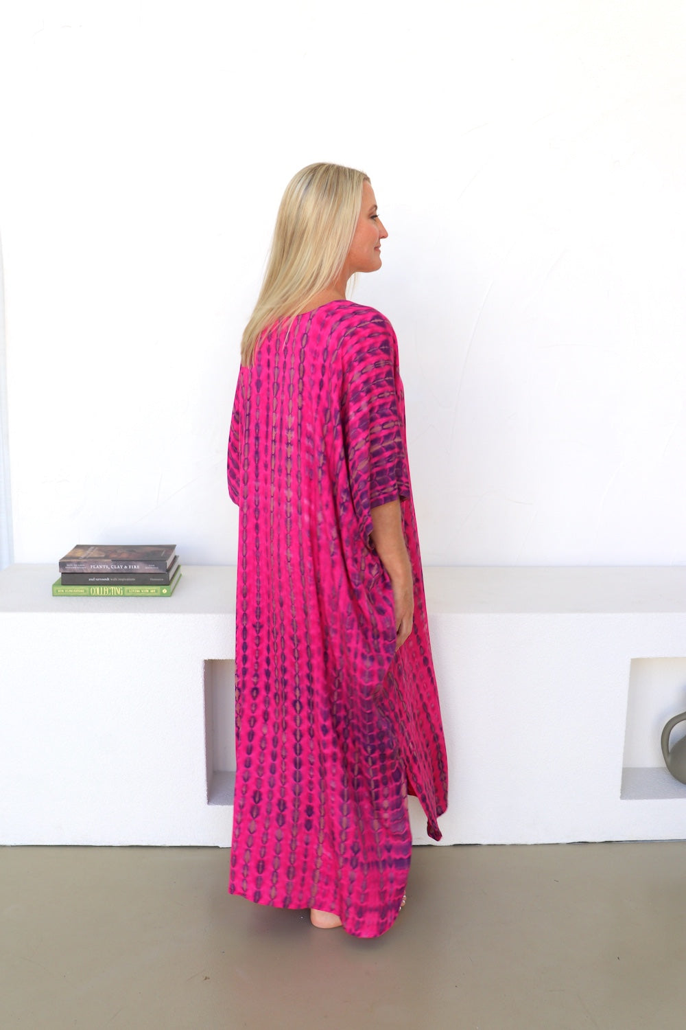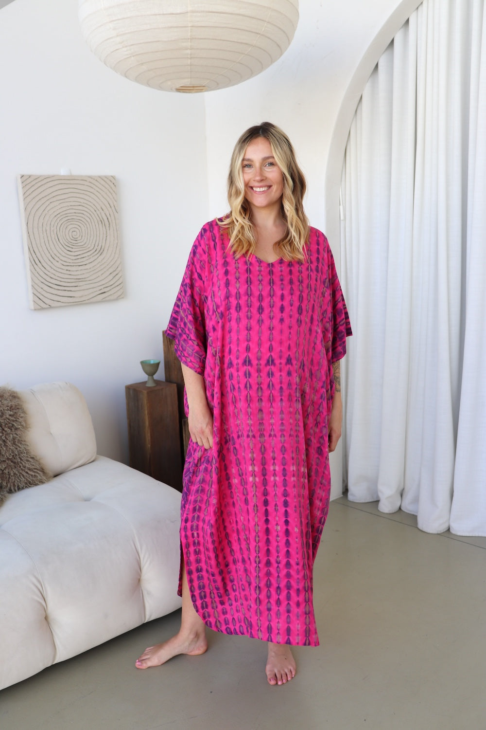 Our Long Kaftan in Hot Pink Tie Dye is your go-to piece for relaxed, effortless style. Made from cool, breathable rayon, it flows beautifully and feels light on the skin—perfect for warm days, holidays, or simply lounging in comfort. The striking tie dye print adds a bold yet timeless touch, while the flattering V-neckline elevates the look.