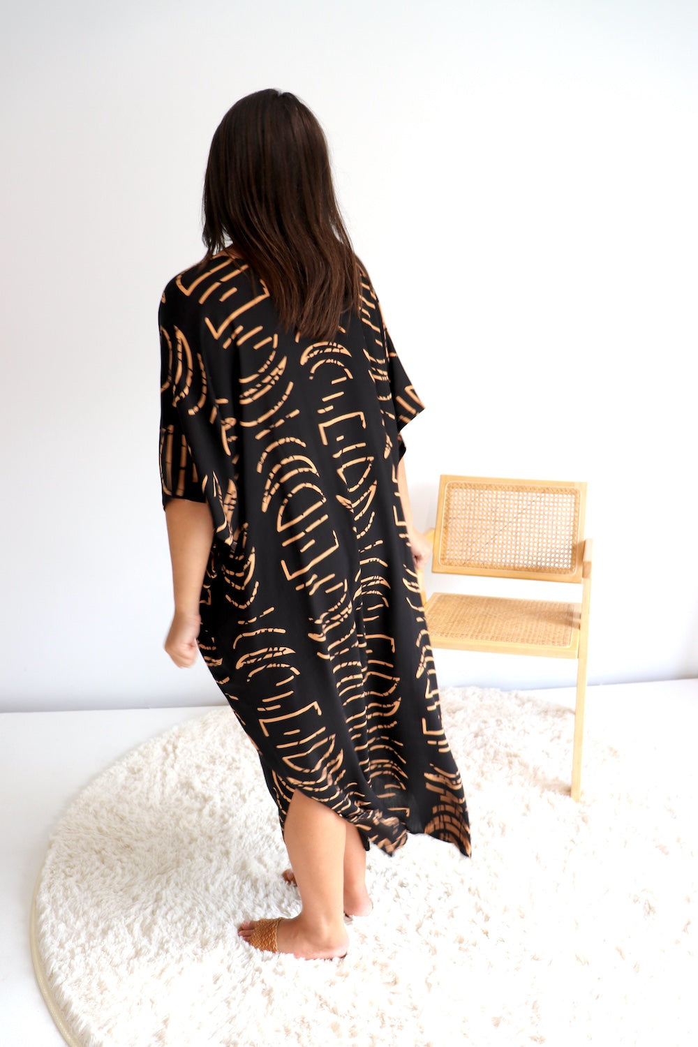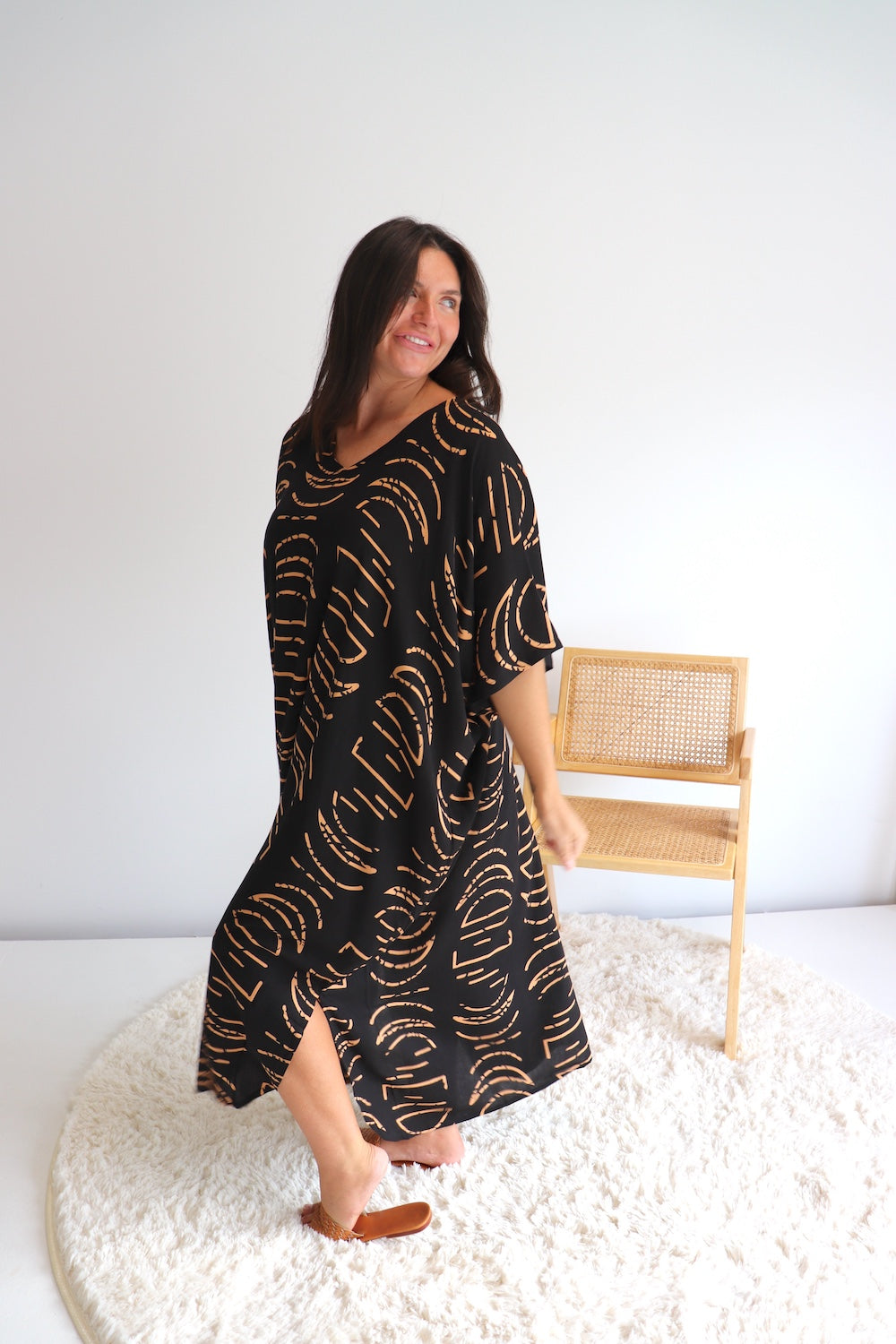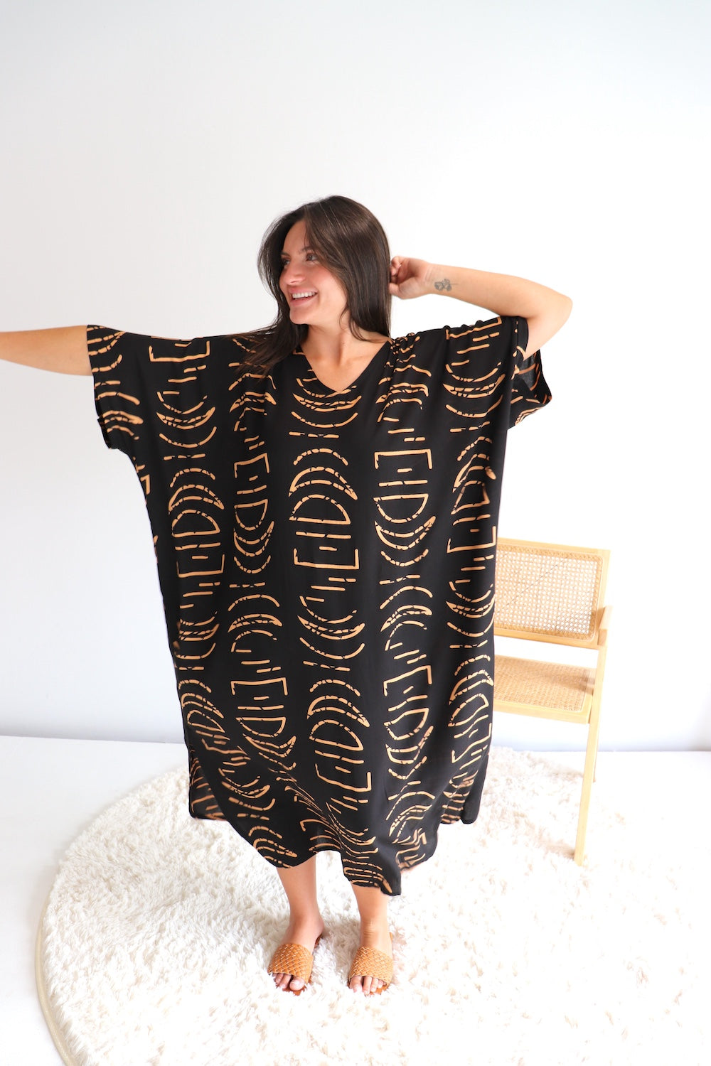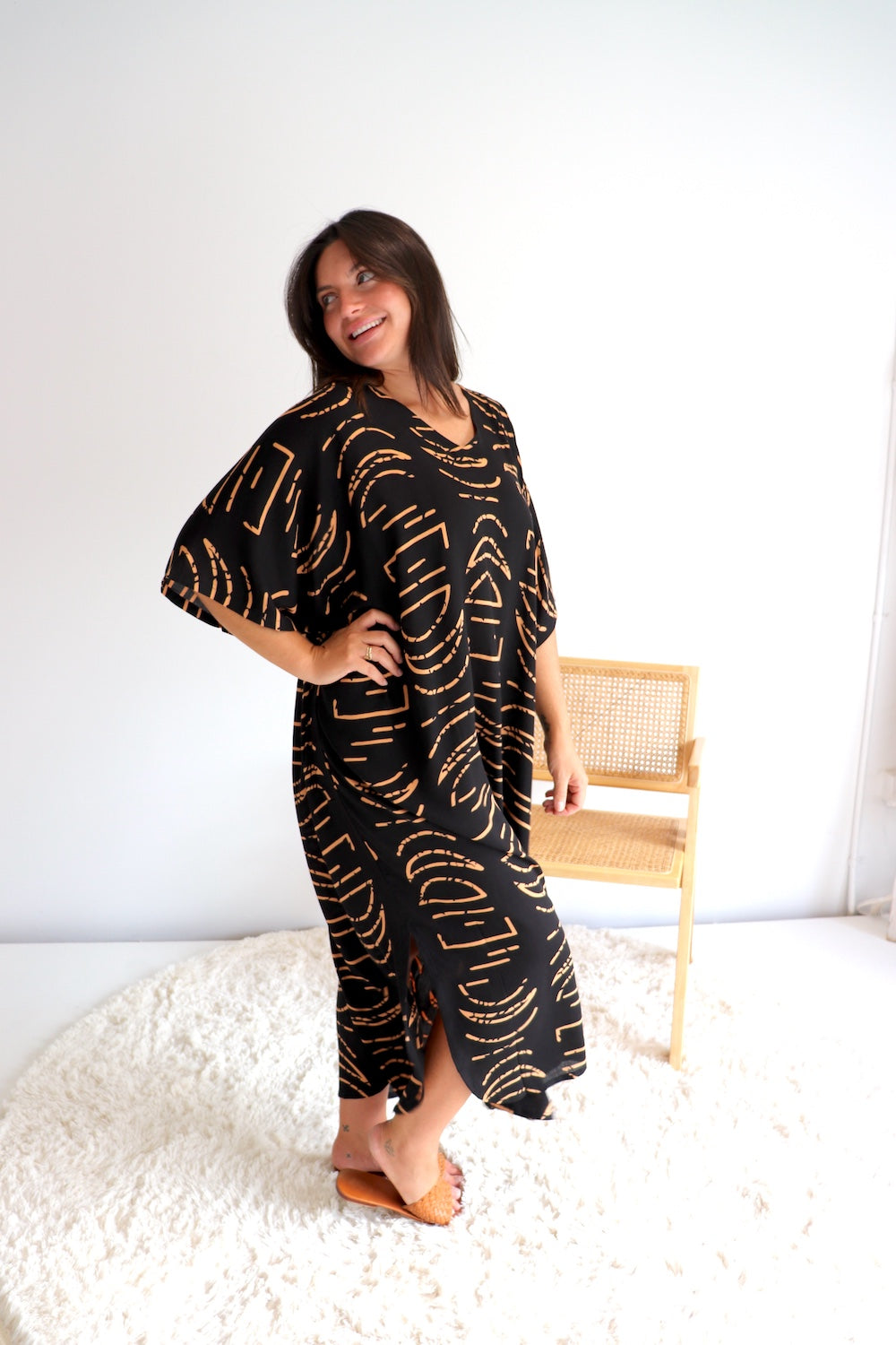 Crafted from our cool, soft, high-quality rayon, this kaftan feels light and airy against the skin—perfect for warm climates and holiday living. The flattering V neckline and side splits create movement and flow, giving it that unmistakable resort elegance.