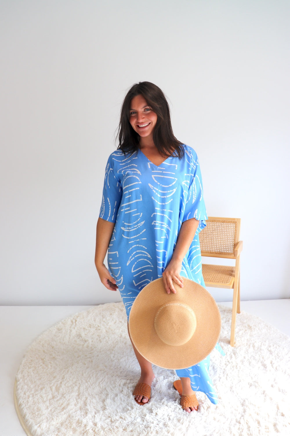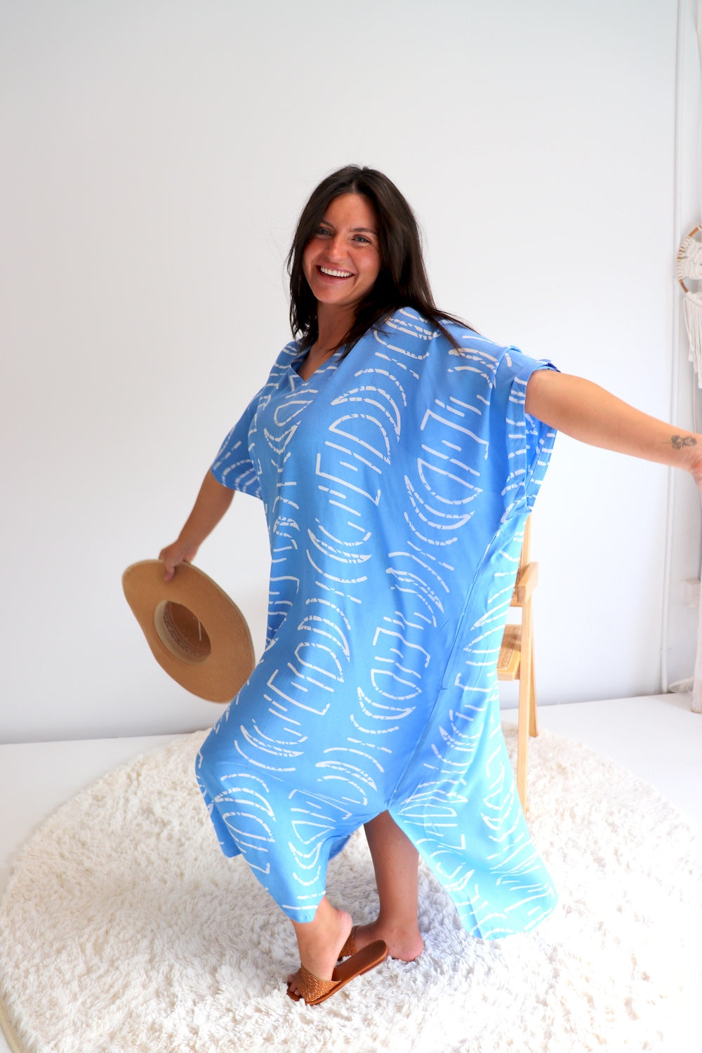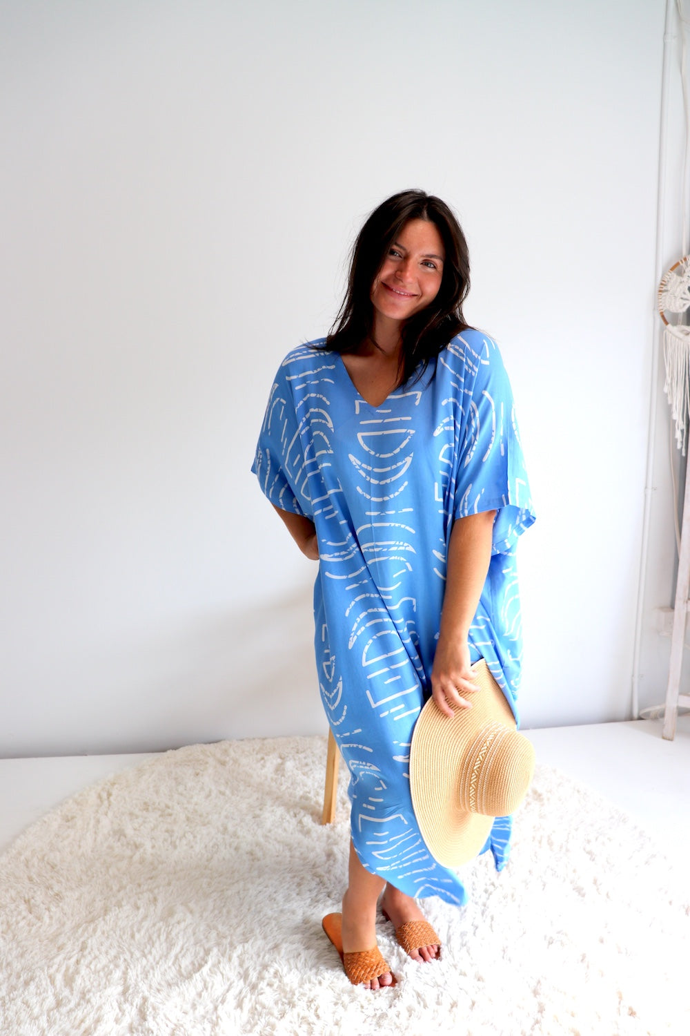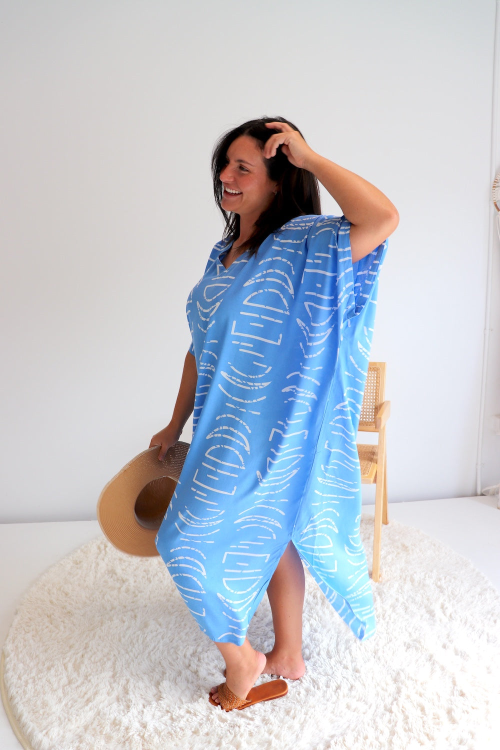 Featuring a flattering V neckline and side splits, this kaftan allows for easy movement and a breezy, flowing feel. Wear it loose for a relaxed resort vibe or style it with one of our coconut sarong clips to create definition and shape at the waist. Perfect for home, beach days or as a standout resort piece, this kaftan is all about comfort, confidence and effortless style.
