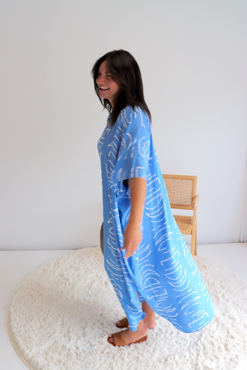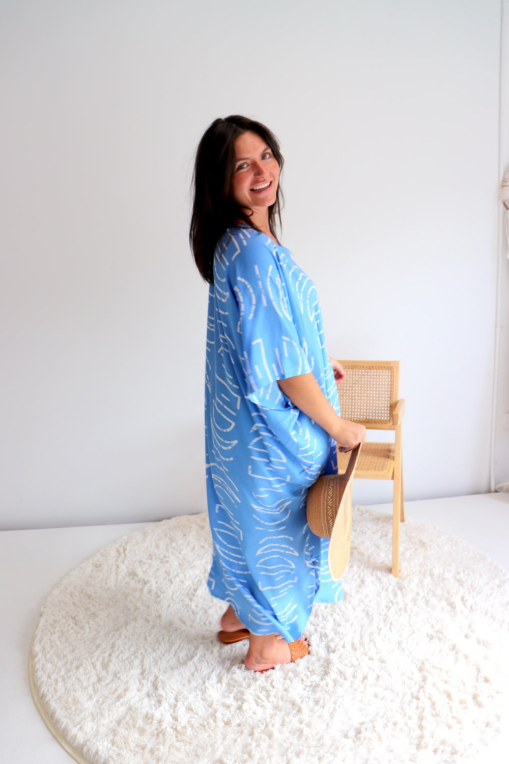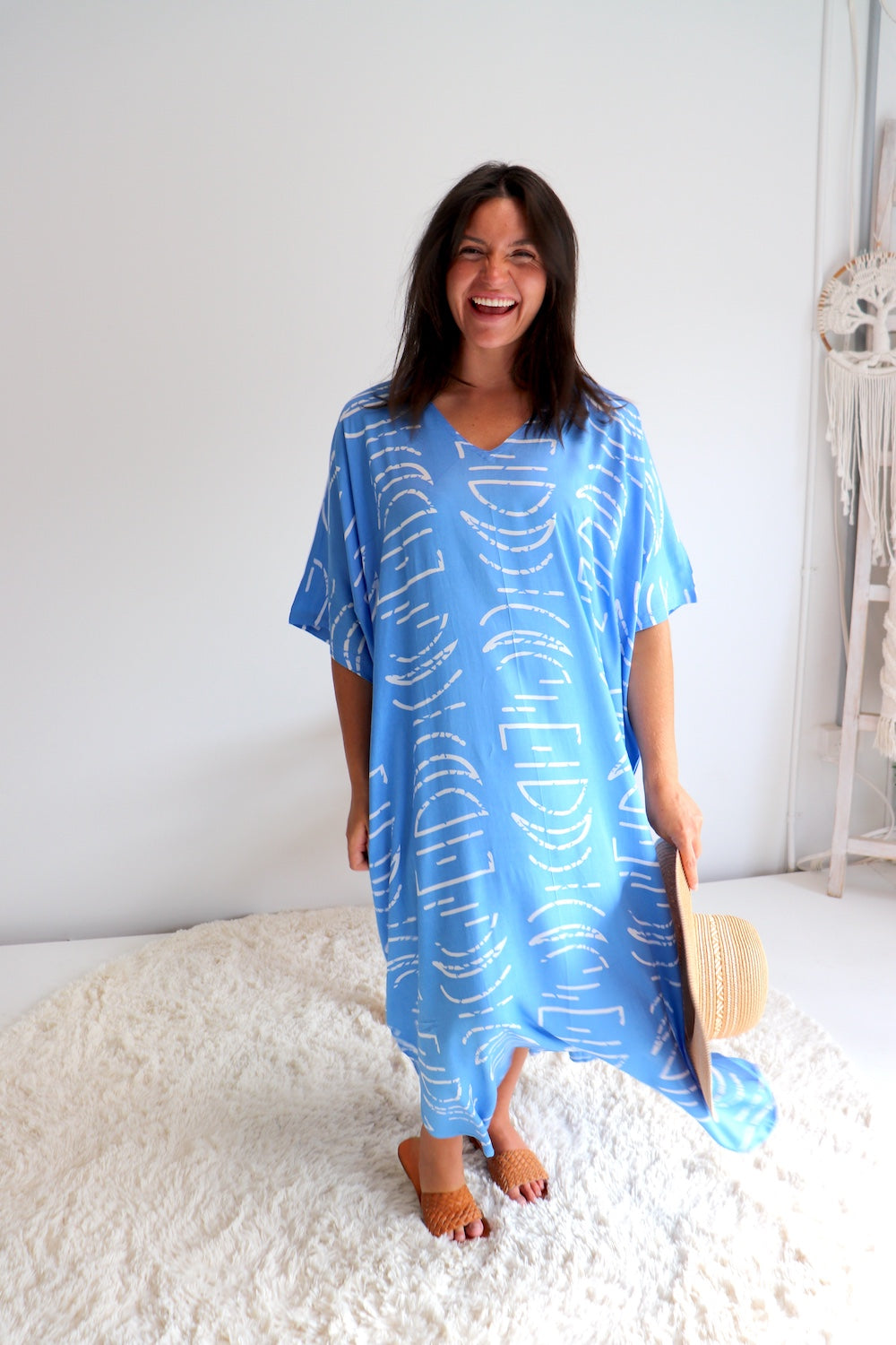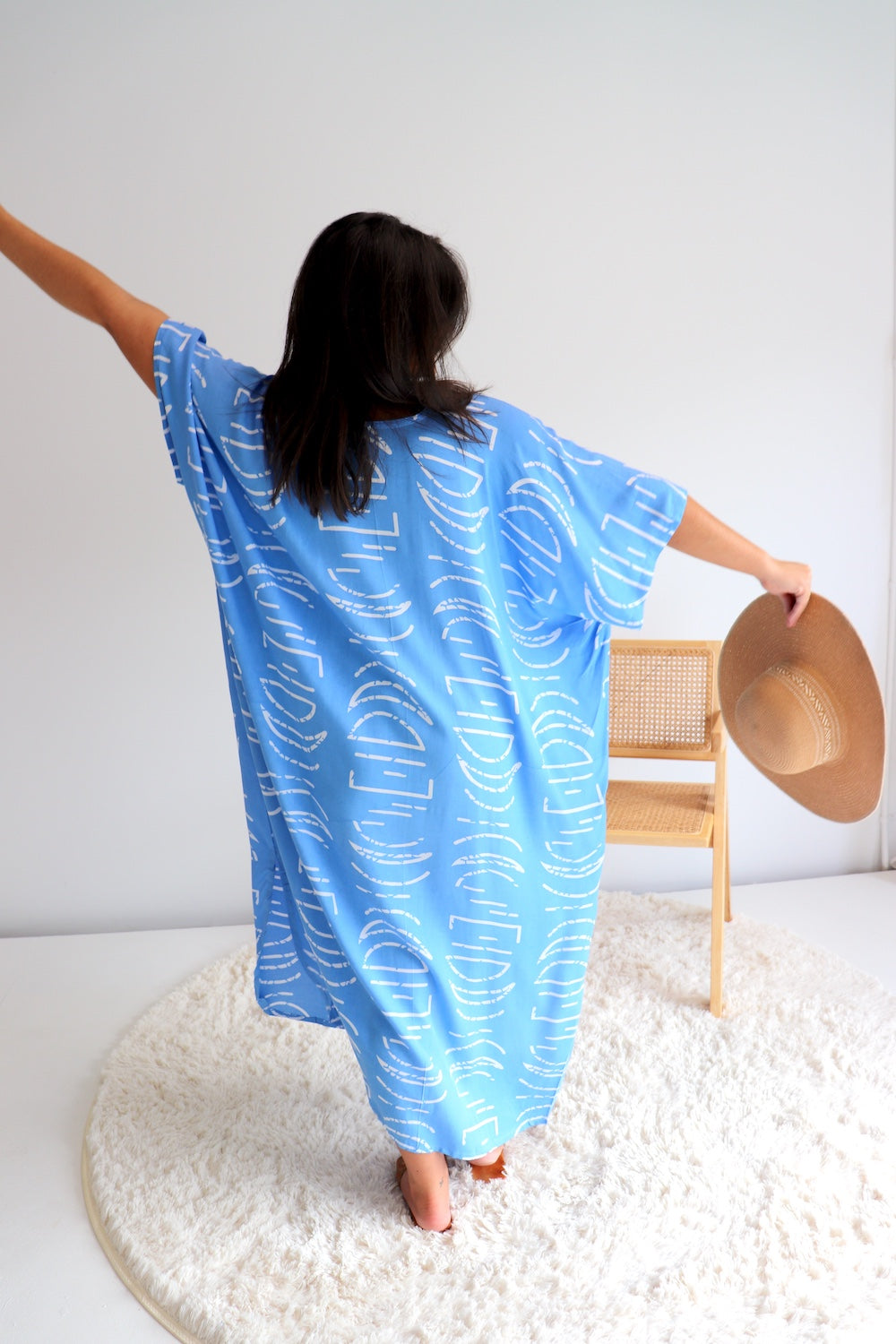 This stunning long kaftan is designed to fit beautifully on sizes 8–26, offering an elegant, relaxed silhouette that flatters every body shape. Made from our cool, soft, high quality rayon, it drapes effortlessly and keeps you comfortable on warm days.