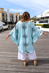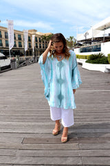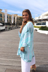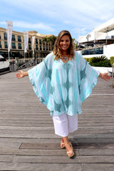 Easy wearing Top/Dress! Featuring Cool and soft rayon fabric, batwing style with a frill bottom, V neck and a tie in the front. Looks stunning with our Cotton 3/4 Siesta Pant!
